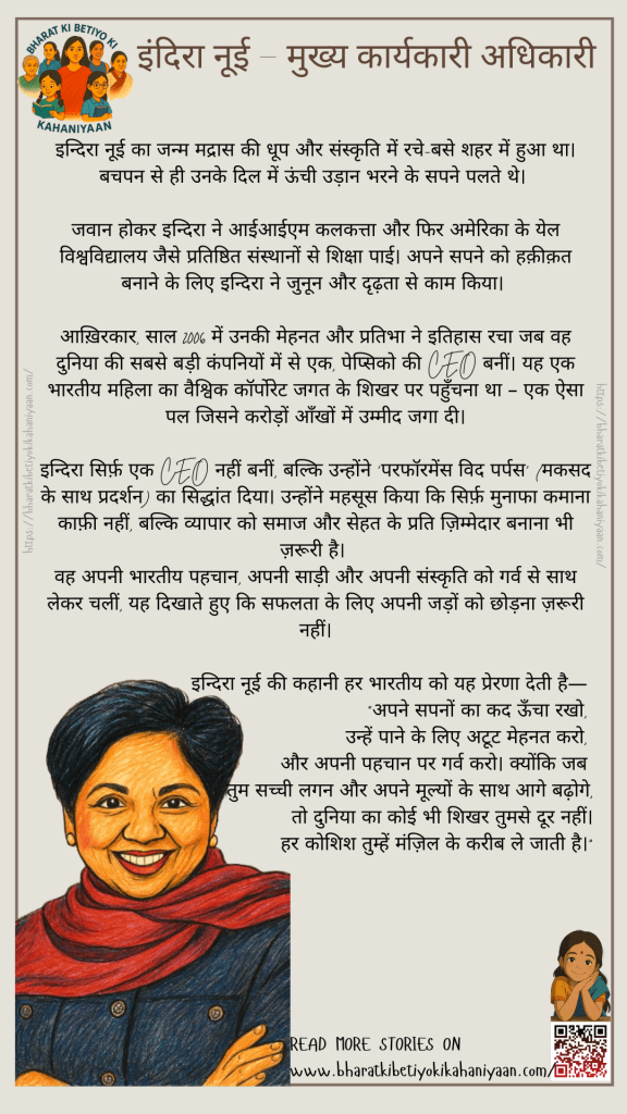 #BharatKiBetiyan, #ChildrenStoriesInHindi, #EdTechIndia, #EmpoweringGirls, #FemaleFoundersIndia, #GirlsEducation, #HindiStories, #IndianRoleModels, #IndianStartups, #IndianWomenLeaders, #InspiringIndianWomen, #OnePageStories, #RealLifeStories, #SocialEntrepreneurship, #StartupsForSocialImpact, #StorytellingForChange, #SuccessStoriesIndia, #WomenEmpowermentIndia, #WomenInHistory, #WomenInspiration, Breaking Barriers Women, Business Executive India, Corporate Leadership, Former PepsiCo CEO, From India to CEO, Global Indian Achievers, Indian CEO Global Company, Indian Origin CEO, Indian Role Model, Indian Women in Business, Indian Women Leaders, Indira Nooyi, Indira Nooyi Biography, Indira Nooyi Chennai, Indira Nooyi Hindi Story, Indira Nooyi IIM Calcutta, Indira Nooyi Journey, Indira Nooyi Kahani, Indira Nooyi Madras, Indira Nooyi Story, Indira Nooyi Yale, indra nooyi, indra nooyi pepsi, indra nooyi story, Inspirational Story, inspiring Indian women, is indra nooyi indian, Leadership Lessons, Motivational Story India, Overcoming Challenges, PepsiCo CEO, Performance with Purpose, Prernadayak Kahani Hindi, Strong Indian Women, Success Story, successful indian women, Women Empowerment India